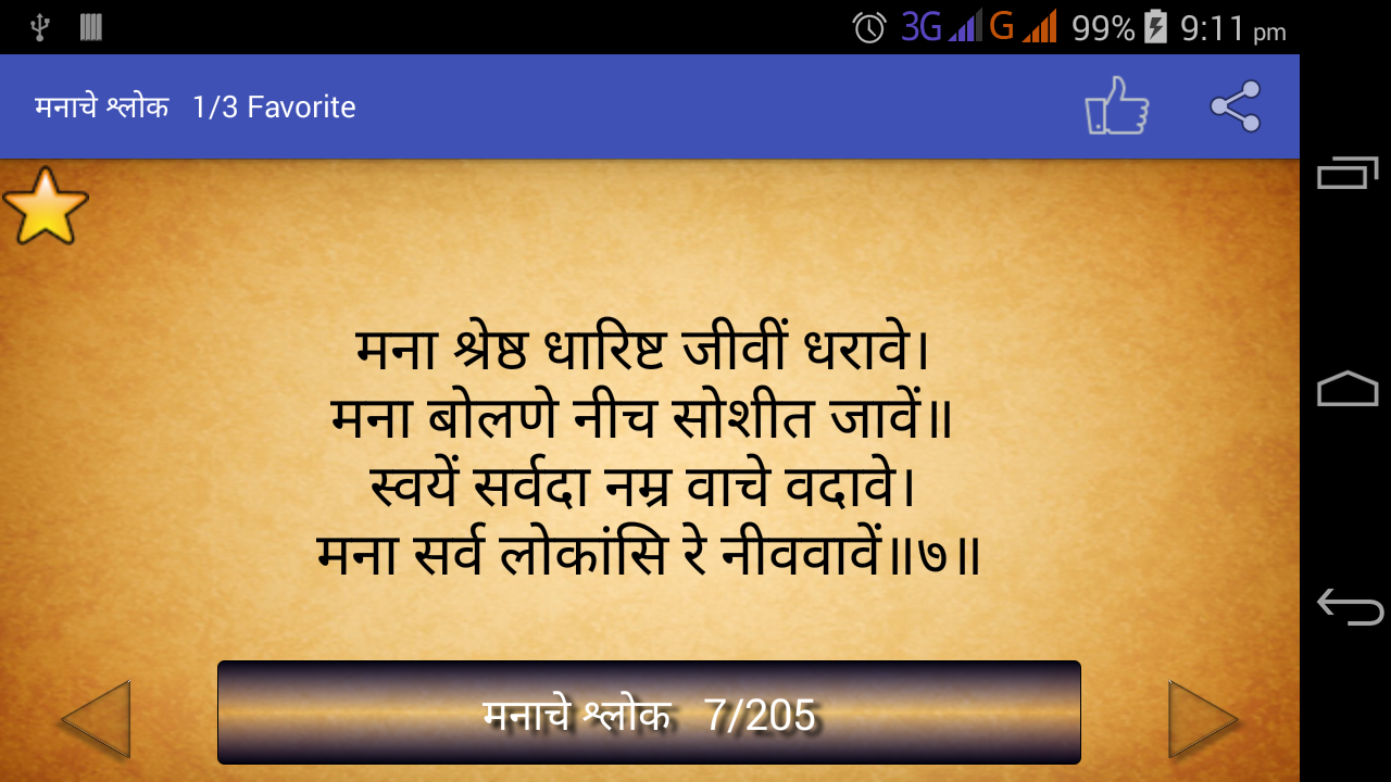 So Application contains 205 Abhangas called "ManacheShlok" also know as Shree Manache Shlok (मनाचे श्लोक)