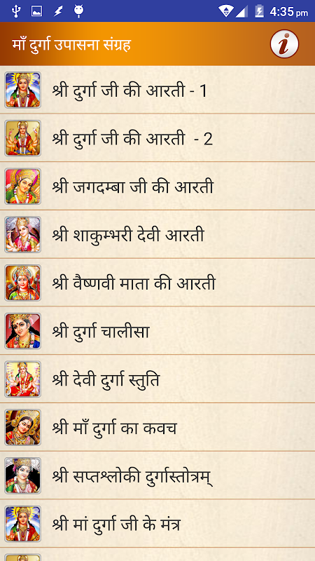 kita sering cenderung lupa kata atau frasa lengkap aartis dan chaalisas saat melakukan doa-doa dan ritual. Aplikasi ini sangat membantu untuk semua umat Hindu. Devi durga adalah salah satu dewi yang paling disembah oleh masyarakat Hindu dan mereka suka bernyanyi aartis dan chaalisa di hampir setiap kesempatan apakah itu Navratri festival atau hanya ritual doa sehari-hari.