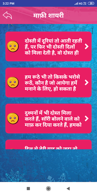 Aplikasi Maafi Shayari & Maaf Status memiliki antarmuka yang ramah pengguna dan basis data besar. Sekarang ubah status Anda setiap hari dengan semua status maaf dan aplikasi shayari. Kami memiliki koleksi status maaf unik dan terbaru di hindi.