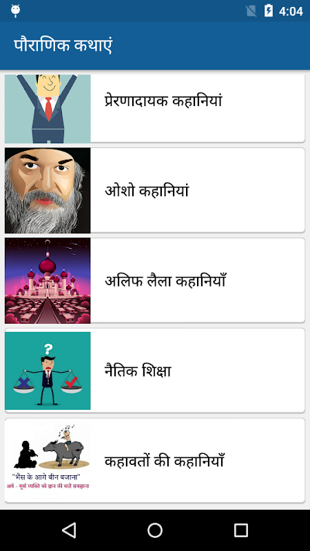 Huge collection of indian hindi stories( hindi kahaniya). Stories are are way to pass the gainful information to our next generations. This app contain big collection of indian hindi stories, which every one should know and pass it to our next generation. These stories are not only for entertainment but are the source of knowledge and information. You will know indian culture more nearly after reading all stories. if you will really like "Hindi Kahaniya" app, Please take a moment to rate this app. All suggesstions are welcome.