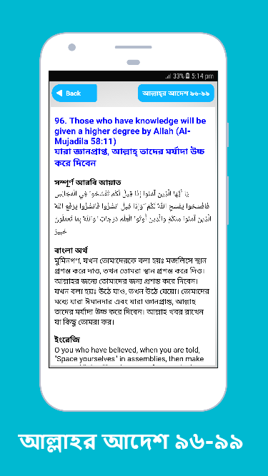 সে জন্য আমাদের প্রত্যকের উচিত কোরআন শিক্ষা ভাল ভাবে গ্রহন করা। আর আল্লাহর উপর ভরসা রেখে জীবন যাপন করা। প্রতিদিনের জিকির ও আমল করা এবং পাঁচ ওয়াক্ত নামাজ সঠিক ভাবে আদায় করা। আর সহজ ভাবে বুঝানোর জন্য এই অ্যাপটিতে আল্লাহর আদেশ গুলো যে আয়াত থেকে নেওয়া হয়েছে সেই আয়াতটি দেওয়া হয়েছে। আয়াতটি আরবিতে, ইংরেজিতে এবং আয়াতের বাংলা অর্থ তুলে ধরা হয়েছে।
