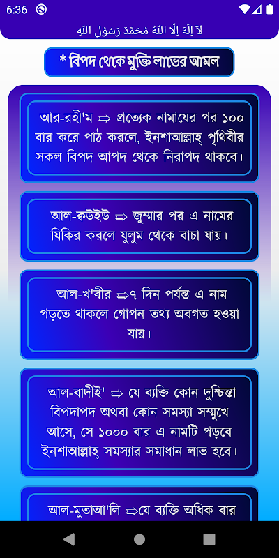 আল্লাহর ৯৯টি গুণ বাচক নাম এবং নামের অর্থ সহ ফজিলত ও আমলের সময় ও নিয়ম সহকারে তুলেধরা হয়েছে এবং এই অ্যাপটিতে হাদিসের ব্যাখ্যা হয়েছে তুলেধরা হয়েছে।