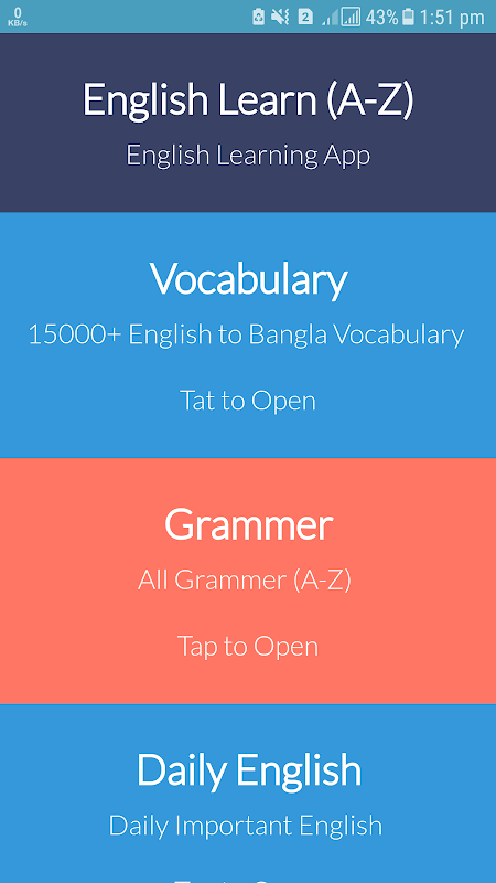 ইংরেজিতে খুব ভাল ভাবে সারাজীবনের জন্য শিখার জন্য আমরাই প্রথম সম্পূর্ণ ফ্রিতে বিভিন্ন কেটাগরিতে ভাগ করে ইংরেজি শিক্ষার সুব্যবস্থা করা হয়েছে । একজন দুর্বল মানুষ ও এই অ্যাপটি যদি অনুসরণ করে তাহলে সেও ইংরেজিতে অনলগ কথা বলতে পারবে । আমাদের এই অ্যাপটি পড়ে খুব সহজেই ইংরেজি এর অনেক কিছু সম্পর্কে অভিজ্ঞ হবেন যা আপনাকে ইংরেজিতে কথা বলার উপযোগি করে তুলবে ।