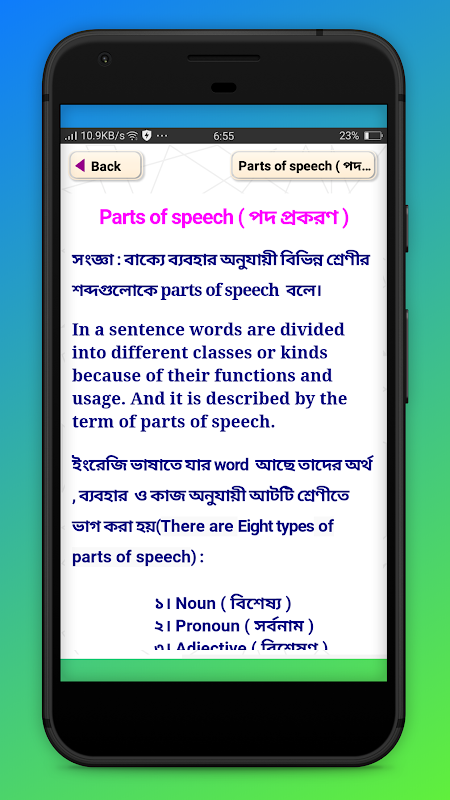 Through this app we have discussed about different branches of english grammar. English grammar is the basic and main part of learning english.The most important part of english grammar is word,syllable,parts of speech,tense, gender and so on, which all are described with examples here in this apps.In this app you will get the details on English Bengali Grammar,English Grammar in Bangla ,english grammar ,tense rules ,parts of speech in bangla ,parts of speech in english ,verb , preposition in english to bengali etc.
