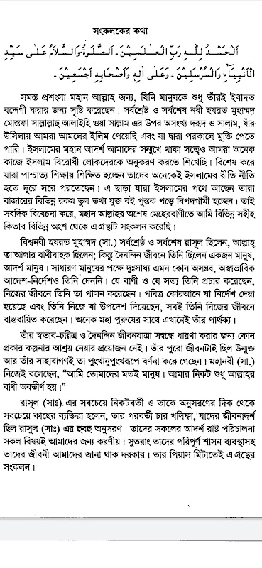 সমস্ত প্রশংসা মহান আল্লাহ জন্য, যিনি মানুষকে শুধু তাঁরই ইবাদত বন্দেগী করার জন্য সৃষ্টি করেছেন। সর্বশ্রেষ্ট ও সর্বশেষ নবী হযরত মুহাম্মদ মোস্তফা সাল্লাল্লাহু আলাইহি ওয়া সাল্লাম এর উপর অসংখ্য দরূদ ও সালাম সালাম, যাঁর উসিলায় আমরা আমলের পেয়েছি এবং যা দ্বারা দ্বারা পরকালে পেতে পারি পারি। ইসলামের মহান আদর্শ আমাদের সম্মুখে থাকা সত্বেও আমরা অনেক কাজে ইসলাম বিরোধী লোকদেরকে অনুকরণ করতে শিখেছি। বিশেষ করে যারা পাশ্চাত্য শিক্ষায় শিক্ষিত হচ্ছেন তাদের অনেকেই ইসলামের রীতি নীতি হতে দূরে সরে পরতেছেন। Anda juga dapat melakukan hal ini Anda juga dapat melakukan hal ini হচ্ছেন। তাই সবদিক বিবেচনা করে, মহান আল্লাহর অশেষ মেহেরবাণীতে আমি বিভিন্ন সহীহ কিতাব বিভিন্ন অংশ থেকে এ গ্রন্থটি সংকলন করেছি।