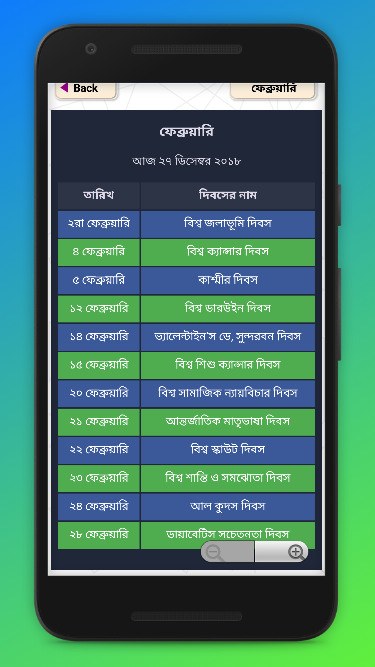 বছরের কোন তারিখে কোন দিবস এ নিয়ে আমাদের এবারের আয়োজন কোন দিন কি দিবস অ্যাপসটি। ইংরেজী বছরের ১২ মাসের প্রায় প্রতিটি দিনই কোন না কোন বিশেষ ঘটনাকে কেন্দ্র করে কোন না কোন বিশেষ দিবস হিসেবে পালিত হয় । বিভিন্ন দিবসে আমাদের দেশে সরকারী ছুটি ( ২০১৯ সালের সরকারি ছুটির তালিকা) পালন করা হয়ে থাকে। বাংলা মাসের কোন মাসে কোন দিবস তাও আমাদের প্রায় সকলের অজানা। হাতে গণা দুই একটা দিন বা দিবস ছাড়া অধিকাংশ দিবসই আমাদের নখদর্পনে নয়। আমরা তাই এই অ্যাপসটি বাংলা মাসের দিবস , ছুটির দিন বাংলা ক্যালেন্ডার অনু্যায়ী , ইংরেজী মাসের দিবস এবং সে অনুযায়ী সরকারী ছুটির দিন গুলো ধারাবাহিকভাবে সাজিয়েছি একদম ক্যালেন্ডার এর মত করেই। এতে করে একই সাথে আপনারা একই সাথে দেশীয় ও আন্তর্জাতিক প্রতিদিনের দিবস সম্পর্কে খুব সহজেই অবহিত হতে পারবেন।দিবস সমূহ জানা থাকলে আমরা ছুটি কাটানোর জন্য সুন্দর পরিকল্পনা করতে পারবো। আমরা শুধু বাংলাদেশ সরকার ঘোষিত জাতীয় দিবস সমূহ যথাঃ- শহীদ দিবস, স্বাধীনতা দিবস, জাতীয় শোক দিবস, সশস্র বাহিনী দিবস, শহীদ বুদ্ধিজীবি দিবস, বিজয় দিবস এবং বাংলাদেশ সরকার অঘোষিত জাতীয় দিবস সমূহ যথাঃ- বঙ্গবন্ধু প্রত্যাবর্তন দিবস, সলঙ্গা দিবস, জনসংখ্যা দিবস, আগরতলা ষড়যন্ত্র মামলা প্রত্যাহার দিবস, ডায়াবেটিক দিবস, রাষ্ট্রভাষা দিবস, কালো রাত দিবস, খাপড়া ওয়ার্ড দিবস, নিরাপদ মাতৃত্ব দিবস , ছয়দফা দিবস, পলাশী দিবস, জাতীয় দিবস ও সংহতি দিবস, বঙ্গভঙ্গ দিবস, স্বৈরচার পতন দিবস, নিরাপদ সড়ক দিবস এই কয়েকটি দিবস সম্পর্কে জানি । এছাড়া ও আরো অনেক দিবস রয়েছে জাতীয় ও আন্তর্জাতিক । যা জানতে সহায়ক হবে আমাদের এই অ্যাপসটি।