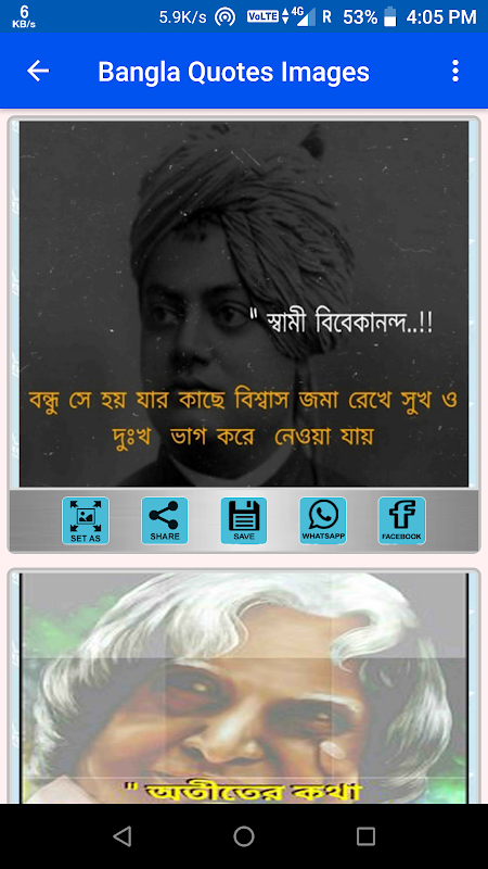 Bangla quotes image app is a fantastic android application. It is very easy to read and share as a image with your friends and family. This application is very easy to use and you can easily share image with your friens via whatsapp,facebook etc. It contain different types of quotes,every update we will add new qoutes and add new categories. This app have contain some amazing features like setas,save,share etc. You can easily set quotes as a walpaper,whatsapp profile . You Also save your quotes image in your mobile storage and this app also provide you to direct share your qoutes with whatsaap,facebook etc.