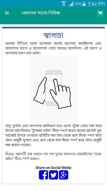 আপনারা এই আপ্পস টি ডাউনলোড করে জেমসের গানের লিরিক্স গুলো শিখতে পারেন ...এই অ্যাপ স এর সম্পর্কে যদি আমাকে কিছু বলার থাকে তাহলে আমাক ইমেইল করতে পারেন নিচে আমার ইমেইল এর ঠিকানা দেওয়া আছে ।