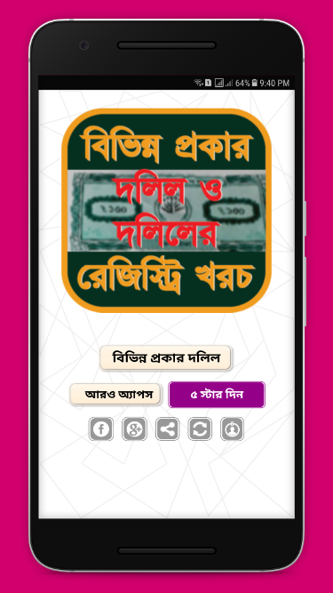 বিভিন্ন প্রকার দলিল ও দলিলের রেজিস্ট্রি খরচ দেখতে এখনি অ্যাপটি ডাউনলোড করুন।