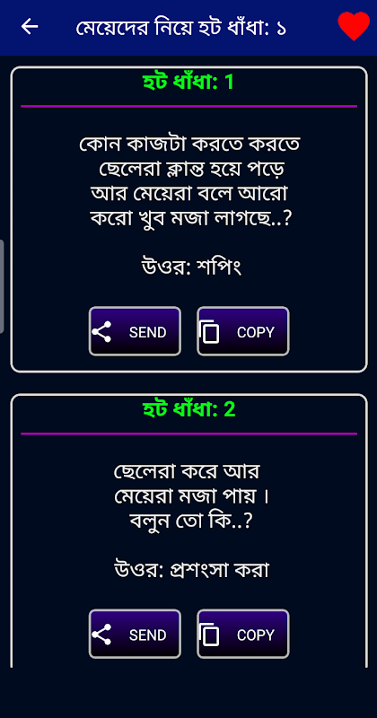 এই অ্যাপ এ আমরা চেষ্টা করেছি এমন সব মজার ধাঁধা ও স্ট্যাটাস লিস্ট করতে যা আপনার অনেক ভালো লাগবে এবং অবসর সময় টা মজা করে কাটাতে পারেন ।