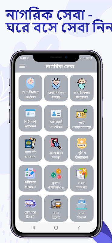 নাগরিক সেবা অ্যাপটি ব্যবহার করে আপনারা এখন ঘরে বসে যে কোনো ধরণের সেবা খুব সহজেই পেতে পারবেন। Kembali ke atas িবন্ধন এর জন্য আবেদন,জনচাই ,জন্মনি বন্ধন সংশোধনের আবেদন করতে পারবেন। NID এর জন্য আবেদন ,স্মার্ট কার্ড এর স্ট্যাটাস চেক ও NID এর সংশোধন এর আবেদন করতে পারবেন। Tidak Ada Iklan েন।বাস ,লঞ্চ ,ট্রেন এর টিকেট কাটতে পারবেন। Kembali ke atas ে পারবেন। Kembali ke atas Pertanyaan Umum ামজারি,খতিয়ান তথ্য অনুসন্ধান ও ভুমি উন্নয়ন ক র দিতে পারবেন।