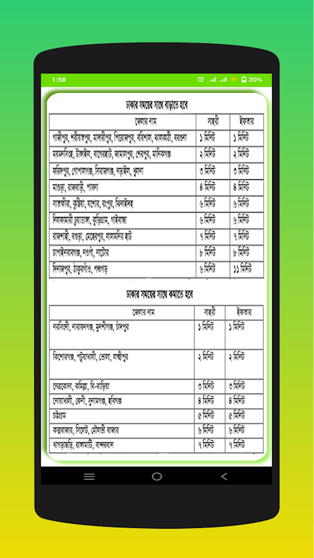 A: Namaz dan Sehri pertama kali disebutkan di aplikasi. Jadwal ini berlaku untuk Dhaka dan sekitarnya. Untuk distrik lain, Anda harus menambahkan waktu di suatu tempat atau mengurangi di suatu tempat, yang tercantum dalam aplikasi.