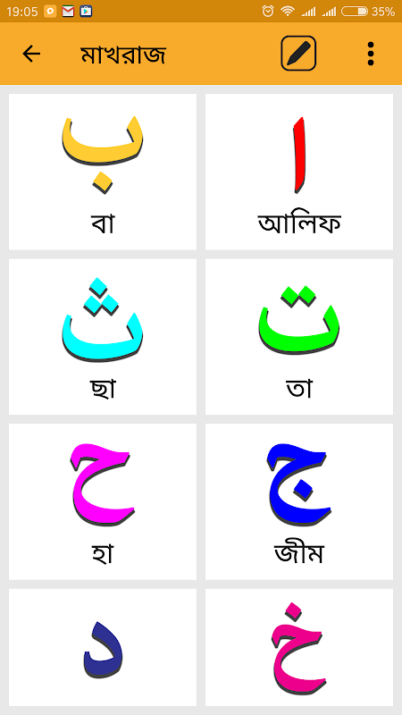 Aplikasi ini dapat digunakan untuk anak-anak belajar bahasa arab serta Alquran. Ini juga berisi latihan tertulis. Bengali adalah aplikasi penting bagi setiap Muslim.
