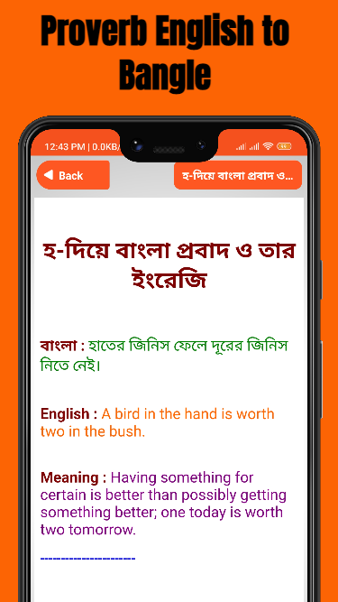 Aplikasi ini menyediakan banyak koleksi favorit dan reguler menggunakan pepatah bengali mis. peribahasa bengali ke bahasa Inggris dan juga peribahasa bahasa Inggris ke bahasa bengali tersedia untuk penutur bahasa Inggris dan Bengali. Seseorang dapat meningkatkan keterampilan berbicara dengan mengungkapkan pepatah bahasa Inggris ini ke bangle. Dengan mengucapkan peribahasa (bahasa Inggris probed), siapa pun dapat dengan mudah menarik perhatian orang lain.