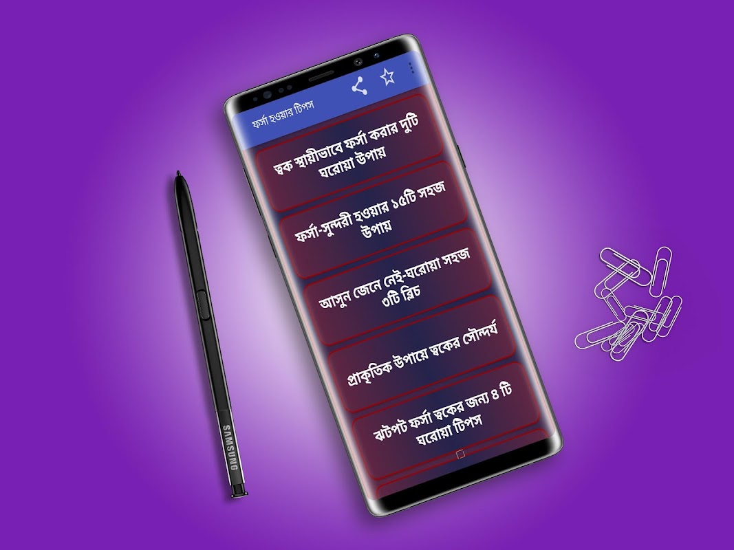 Forsha Howar Sohoj Upay is a beauty tips bangla best app. Who doesn't want to be a owner of a fair and beautiful skin? Thus everyone tries all sorts of sundor hobar tips. BD people search for beauty tips in bengali. Some look for herbal way to get a fair skin. We accumulated allmost major bangla beauty tips so that you may find the right way to whitening your skin.