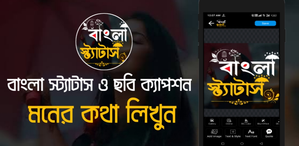 Status Bangla & Aplikasi Keterangan Foto Bangla memiliki banyak alat pengeditan. Keterangan Foto Status Bangla dapat dirancang dengan gaya sesuai keinginan dan keterangan dapat disimpan. Keterangan Foto dapat diunduh. Status Bangla & Aplikasi Keterangan Foto memiliki kategori keterangan foto status tidak terbatas.