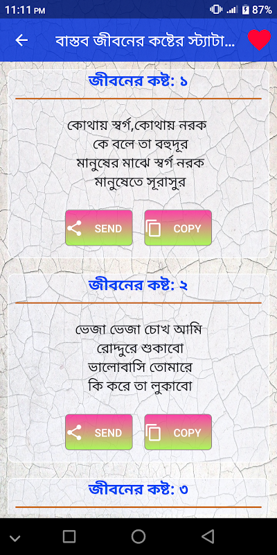 বাংলা কষ্টের স্ট্যাটাস অ্যাপটিতে রয়েছে বেশ কিছু বাস্তব জীবনের কষ্টের স্ট্যাটাস ও এসএমএস, আশাকরি আপনাদের খুব ভালো লাগবে অ্যাপসটি। কষ্টের স্ট্যাটাস bangla sad status থেকে যে কাউকে স্ট্যাটাস পাঠাতে পারবেন।