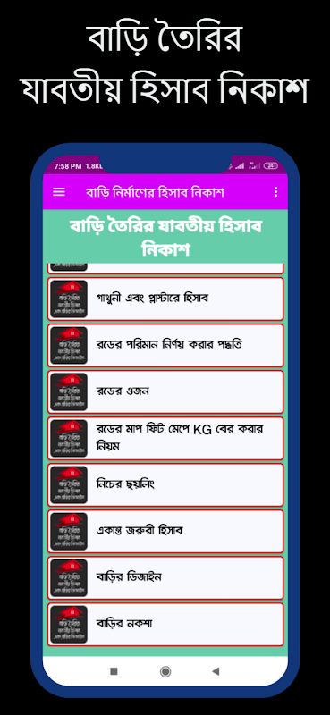 Kami telah membuat aplikasi baru ini dengan semua perhitungan bangunan rumah (bari korar hisab). Kami tidak tahu banyak perhitungan untuk membangun rumah baru. Kami telah membuat aplikasi ini untuk keuntungan Anda.