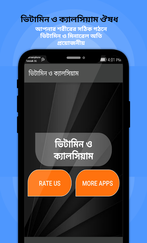 vitamin & kalsium sangat penting untuk tulang pembentukan dan jaringan & bagian lain dari tubuh manusia. jika seseorang belum cukup vitamin atau kalsium mereka harus menderita penyakit yang berbeda seperti kekurangan gizi & juga banyak penyakit yang rumit, sehingga dengan aplikasi ini masyarakat harus memperoleh banyak pengetahuan tentang vitamin & kalsium & mereka mengambil vitamin yang tepat yang baik baginya, itu penuh bahasa bangla untuk dengan mudah memahami