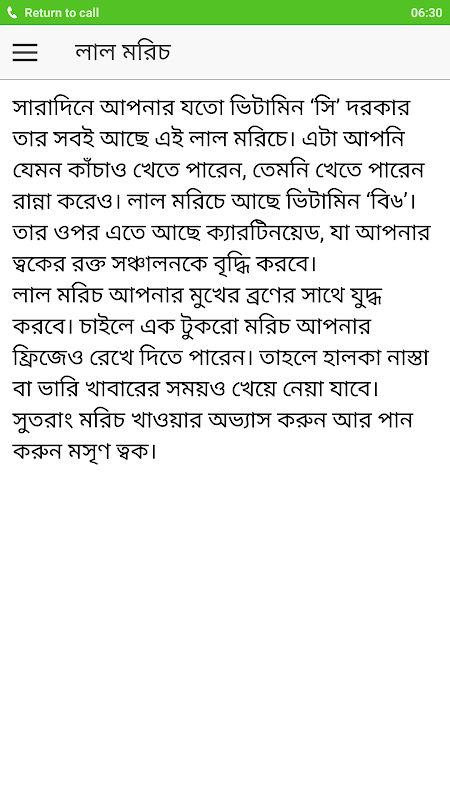 সারাদিনে আপনার যতো ভিটামিন ‘সি’ দরকার তার সবই আছে এই লাল মরিচে। এটা আপনি যেমন কাঁচাও খেতে পারেন, তেমনি খেতে পারেন রান্না করেও। লাল মরিচে আছে ভিটামিন ‘বি৬’। তার ওপর এতে আছে ক্যারটিনয়েড, যা আপনার ত্বকের রক্ত সঞ্চালনকে বৃদ্ধি করবে। লাল মরিচ আপনার মুখের ব্রণের সাথে যুদ্ধ করবে। চাইলে এক টুকরো মরিচ আপনার ফ্রিজেও রেখে দিতে পারেন। তাহলে হালকা নাস্তা বা ভারি খাবারের সময়ও খেয়ে নেয়া যাবে। সুতরাং মরিচ খাওয়ার অভ্যাস করুন আর পান করুন মসৃণ ত্বক।