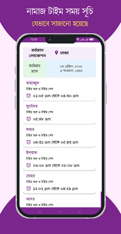 Dan perhitungan waktunya tidak akan salah. Fitur waktu shalat kami yang akurat akan menampilkan jadwal pasti berdasarkan lokasi Anda. Yang akan membantu Anda mempersiapkan doa.