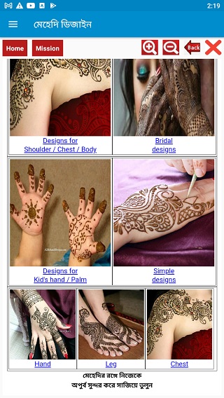 Desain ini termasuk desain mulai dari Arab, India, Pakistan, Bangladesh, pengantin, bunga, gola, mawar, bulat, tiki & variasi romantis.