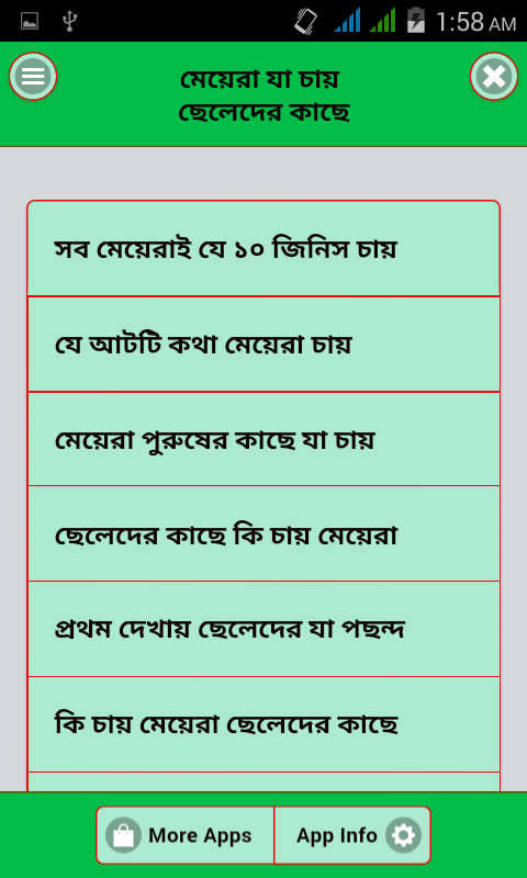 মেয়েরা সবসময়য়েই ভালোবাসার পূজারী হয়ে থাকে এবং পরম ভালোবাসায় সারাজীবন ভালোবাসার মানুষকে জড়িয়ে ধরে বাঁচতে চায়। মেয়েরা ছেলেদের কাছে যা চায় এই প্রশ্নটি সকল ছেলেদের মনেই থাকে। সব ছেলেরই জানার ইচ্ছে থাকে যে একজন মেয়ে কামন ছেলে পছন্দ করে বা মেয়েরা কেমন ছেলেদের নিয়ে স্বপ্ন দেখে। মেয়েরা ছেলেদের কাছে যা চায় এই অ্যাপ এ আমরা আপনার কিছু না জানা প্রশ্নের উত্তর দিয়েছি যার মাধ্যমে আপনি মেয়েদের মনের গোপন কথা জানতে পারবেন এবং বুঝতে পারবেন যে মেয়েরা কেমন ছেলেদের ভালোবাসে। আপনার নারীর মনের গোপন চাওয়া জানা থাকার কারনে আপনিও আপনার ভালোবাসার মানুষের কাছে পাওয়ার জন্য নিজেকে প্রচতুত করতে পারবেন।