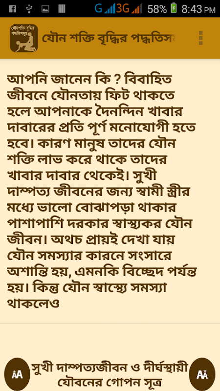 অথচ একটু জানা-শুনা থাকলেই আর sex power বাড়ানোর কিছু কৌশল শিখে নিলে ঘরে বসেই আর বিনা চিকিৎসাতেই আপনিও বাড়াতে পারেন আপনা যৌনশক্তি। মিলনে দীর্ঘস্থায়ী হওয়া, বীর্য ঘন করা, উত্তেজনা বৃদ্ধি আর মিলনে সফলকাম হওয়ার নিয়মাবলী নিয়ে সাজিয়েছি আমাদের এই অ্যাপলিকেশনটি। আশা করি সকলেরই কাজে লাগবে।