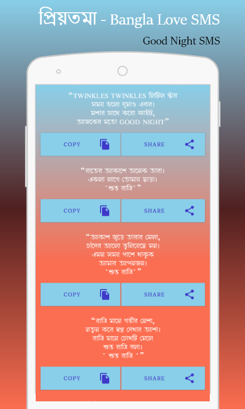 বন্ধুরা এই অ্যাপটির মধ্যে আপনারা নানান ক্যাটাগরির অসংখ্য নতুন নতুন বাংলা ভালোবাসার এসএমএস ও কবিতা পাবেন ।