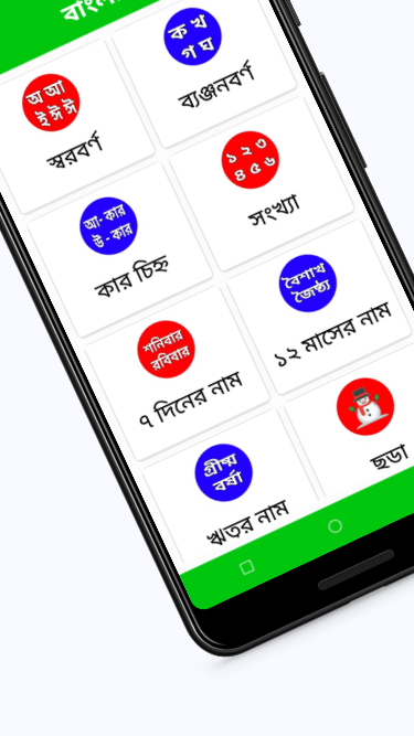 Pembelajaran Anak - Aplikasi Alfabet dan Tulisan Tangan Bengali. Aplikasi pendidikan komprehensif kami memberdayakan anak-anak untuk mempelajari huruf Bengali, Inggris, dan Arab sambil menikmati aktivitas menarik seperti berhitung, penjumlahan, pengurangan, perkalian, pembagian, dan menjelajahi bilangan Romawi dan bilangan prima/komposit. Platform ini menawarkan cara gratis dan menyenangkan bagi anak-anak untuk mempelajari puisi Bengali, huruf Arab, suara binatang, nama sayur, nama burung, dan mata pelajaran pendidikan lainnya. Aplikasi pembelajaran alfabet Bengali ini adalah alat yang berharga untuk pendidikan anak Anda, memudahkan mereka mempelajari alfabet Bengali, Inggris, dan Arab. Mereka juga dapat mempelajari puisi Bengali dan Inggris serta cerita pendidikan lainnya.