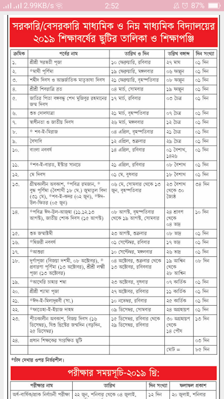 গণপ্রজাতন্ত্রী বাংলাদেশ সরকারের মাধ্যমিক ও উচ্চ শিক্ষা বিভাগ, শিক্ষা মন্ত্রণালয়, ডিসেম্বর, ২০১৮ খ্রি: মাসে সরকারি ও বেসরকারি পর্যায়ের মাধ্যমিক স্কুল ও কলেজ সমূহের জন্য ২০১৯ খ্রি: সালের ছুটির তালিকা ও বিভিন্ন পরীক্ষার সম্ভাব্য সময়সূচি প্রকাশ করেছে।