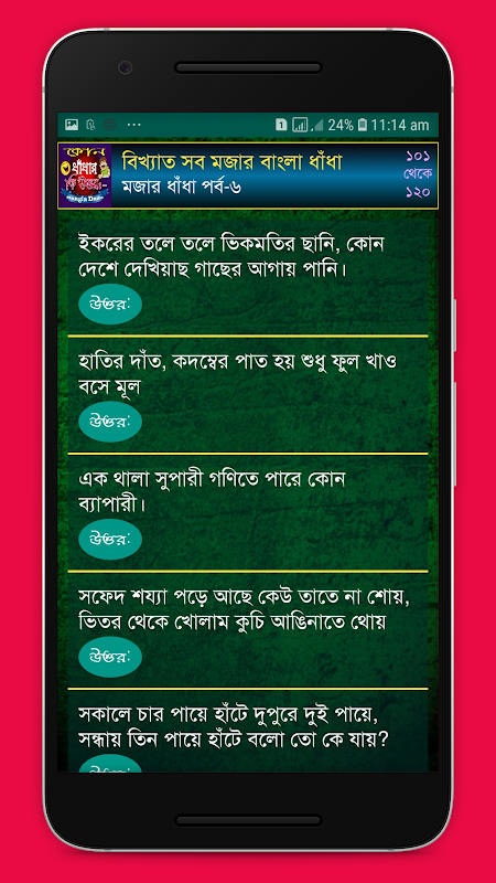 আমাদের অ্যাপে থাকছে ধাধা ও উওর,ধাধার আসর,বাংলা ধাধা ,মজার ধাধা,মজার জোকস,মজার প্রশ্ন,ধাধার বই,সাধারন জ্ঞান ,গ্রাম বাংলার ধাধা,বুদ্ধির প্রশ্ন,আইকউ আরো বুদ্ধি যাচাই এর অনেক কিছু।