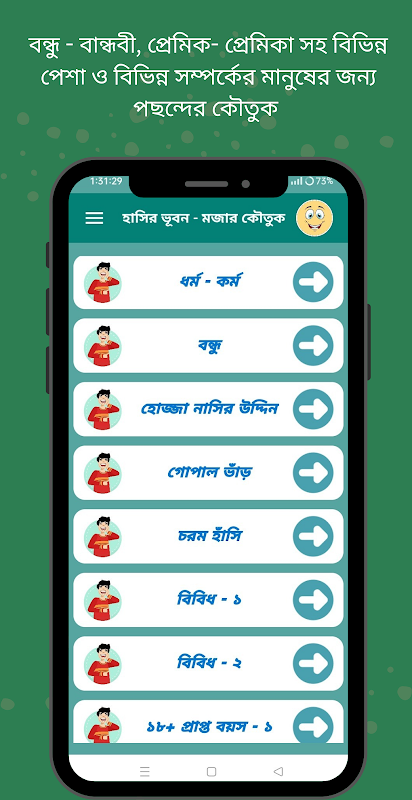 Aplikasi lelucon Bengali kami yang indah, Hasir Bhuban - lelucon lucu disusun dengan lelucon terbaik pilihan. Sebagai orang berbahasa Bengali, hampir semua dari kita suka membaca lelucon lucu berbahasa Bengali. Dalam kehidupan kita yang sibuk, ketika kita lelah karena tekanan pekerjaan atau lingkungan yang berbeda, orang yang berbeda mencoba cara yang berbeda untuk menikmati atau mendapatkan kesenangan, seperti beberapa orang mencoba menghadirkan kegembiraan dan kedamaian dengan membaca lelucon Bengali dari berbagai media online atau aplikasi offline. Seringkali kita suka membahagiakan orang lain dengan menceritakan lelucon di berbagai chat atau acara bersama teman. Aplikasi Hashi Bhuvan - Lelucon Lucu kami hanya untuk mereka yang menyukai lelucon lucu.