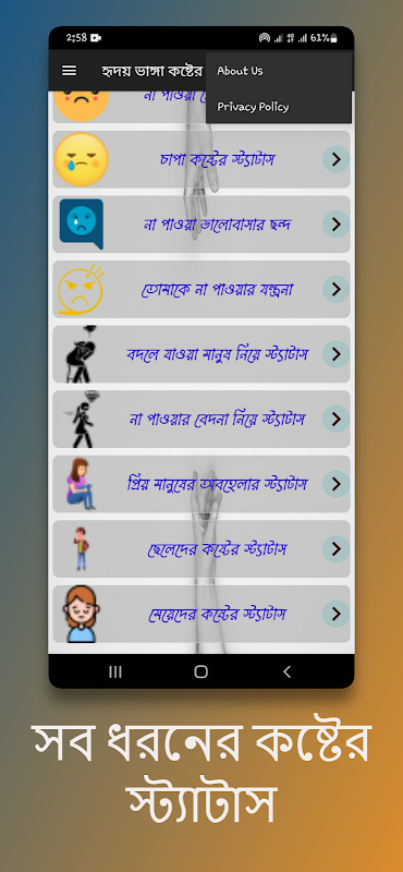 📌 অ্যাপে কিছু নতুন হৃদয় ভাঙ্গা কষ্টের স্ট্যাটাস যোগ করা হয়েছে।