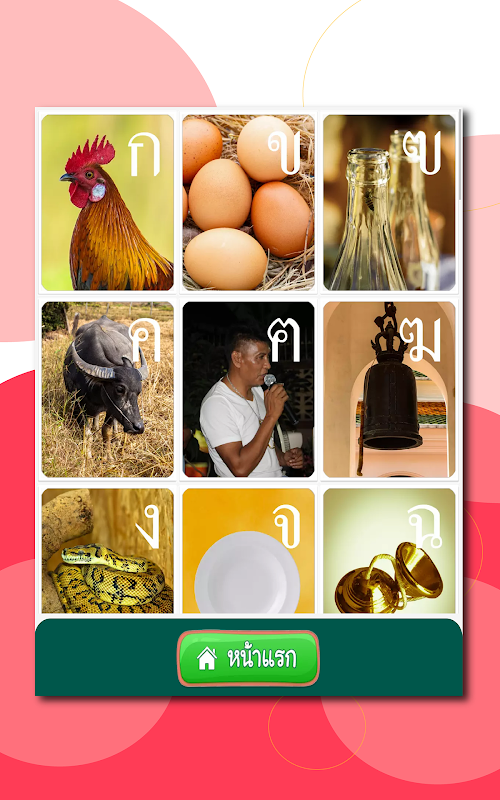 Aplikasi untuk berlatih membaca bahasa Thailand, pengucapan g.oi, g.kai, hingga h.owl, mata besar, membuat anak-anak mengucapkan semua 44 konsonan Thailand dengan benar dengan gambar nyata.