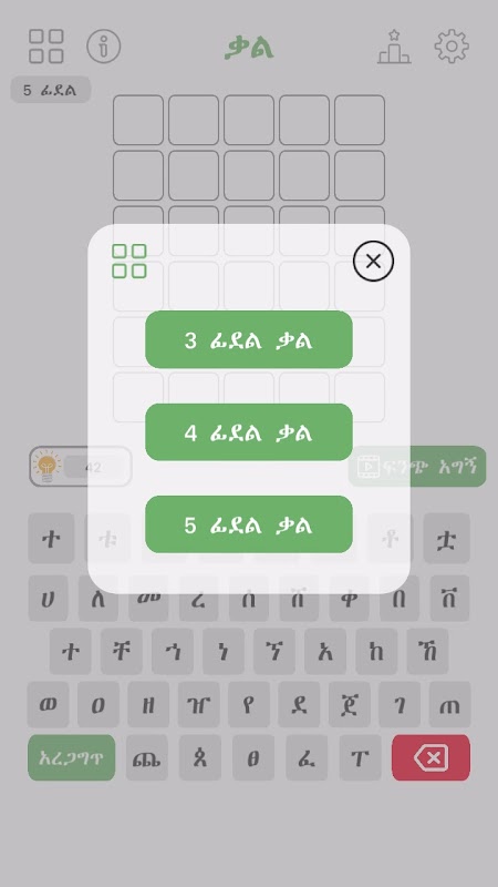 Bahasa Amharik Ethiopia (አማረኛ) Game Wordle dengan 3 Huruf, 4 Huruf, dan 5 Huruf Gameplay plus tidak ada batasan dan Anda dapat menggunakan petunjuk untuk menebak kata-kata saat sulit