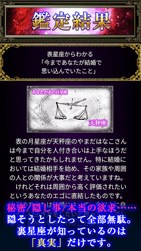 Dan ramalan ini adalah [ramalan bintang belakang] untuk mengetahui semua niat sebenarnya, rahasia yang tidak bisa diungkapkan, dan perasaan yang tersembunyi dari orang itu. Ada perbedaan antara ekspresi wajah yang ditampilkan di depan dan perasaan yang tersembunyi di belakang ... Hanya Anda yang bisa mengetahuinya. Mohon terima semua orang itu.