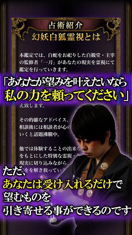 「ここで見たこと。聞いたことは秘密にしてください。」本占いは号泣者続出の鑑定で知られる白観堂主宰の「一刀」が特別な霊視法と複合的な霊視法を用いて鑑定をしていきます。