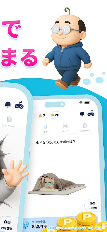Cocokkan langkah Anda dengan teman-teman Anda untuk mendapatkan poin, berkompetisi dengan teman-teman Anda untuk mendapatkan poin, dan ada banyak elemen menyenangkan! Anda juga dapat memperoleh poin melalui permainan! Jika Anda akan bermain game, mulailah dengan Ojipo!