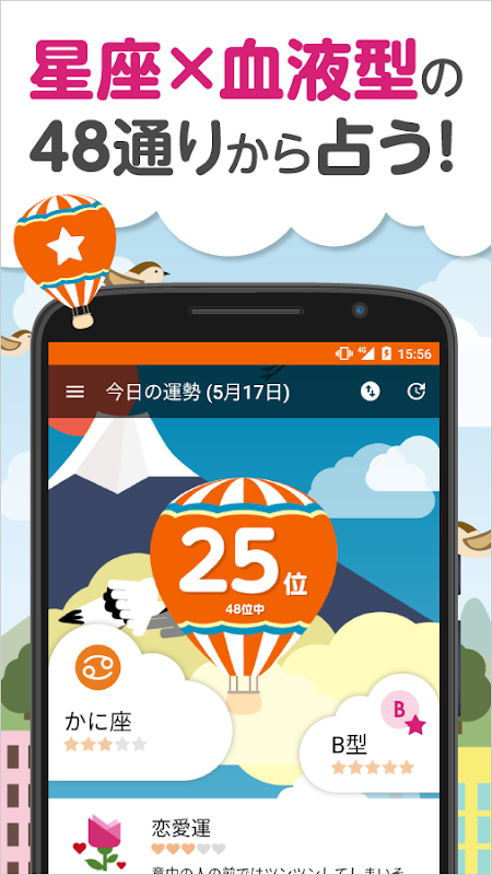★今日の運勢、あなたは何位?★かわいい気球で今日の占いを見に行こう今日の順位は星座×血液型の48通り!恋愛運やあの人との相性もチェック!