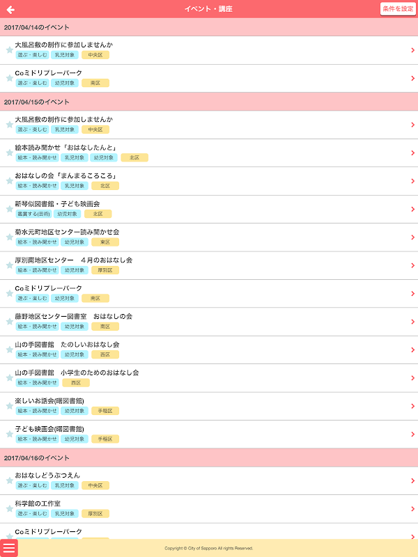 札幌市の子育て世帯向けのイベントを簡単に検索できます。イベント種類やエリアからもチェック可能です。