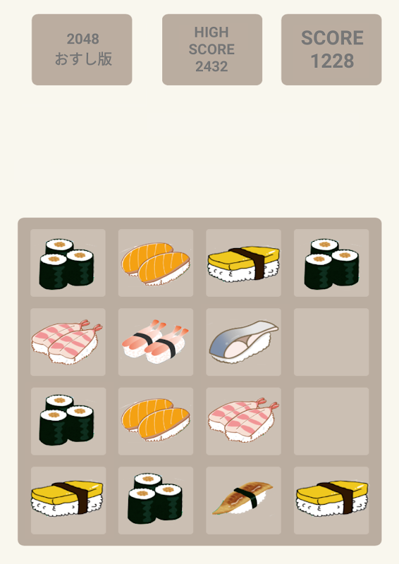 2048 itu telah menjadi restoran sushi. Saat Anda mengumpulkan sushi, sushi akan berubah. Lebih sulit dari 2048 biasanya karena perlu mengantisipasi pergantian sushi berikutnya dan mengumpulkannya.