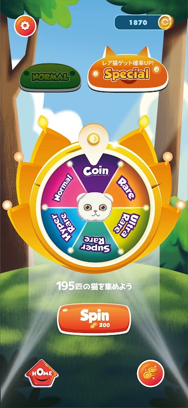 Ruang Kucing dibagi menjadi Normal, Langka, Super Langka, Ultra Langka, dan Hyper Langka, dan Anda dapat bermain dengan kucing dan mainan yang didapat.