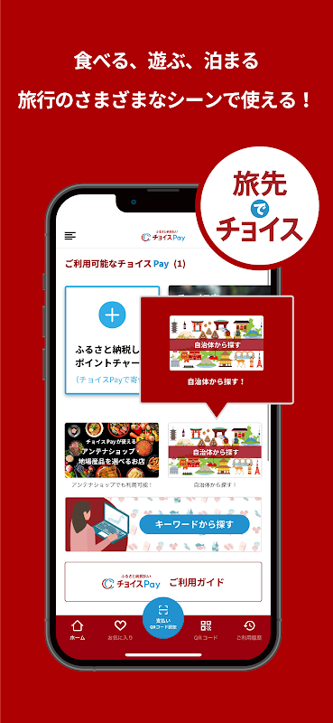 Choice Pay adalah aplikasi yang memungkinkan Anda menikmati perjalanan dan berbelanja dengan poin yang Anda terima sebagai hadiah ucapan terima kasih atas pembayaran pajak kampung halaman, dioperasikan oleh "Furusato Choice", situs pembayaran pajak kampung halaman dengan jumlah hadiah ucapan terima kasih tertinggi / pemerintah daerah di Jepang.