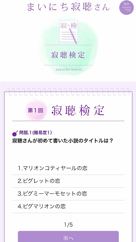 寂聴さんについての検定クイズを出題。あなたの寂聴さん愛とオタク度が試される楽しい検定です。正解すると「徳POINT」が積めます。ボーナス問題に正解すると、「ボーナス徳POINT」も!