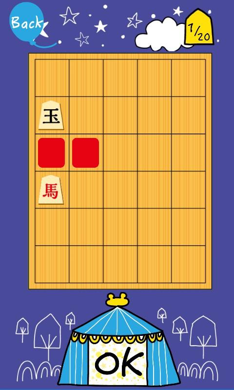将棋の盤上に駒が現れたら、動けるマスをすべてタップします。OKボタンを押し、正解であれば○が、不正解であれば×が表示されます。