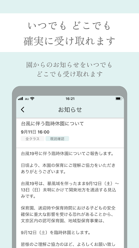 Ini adalah aplikasi untuk orang tua dari "Mierun", alat komunikasi antara taman dan orang tua.