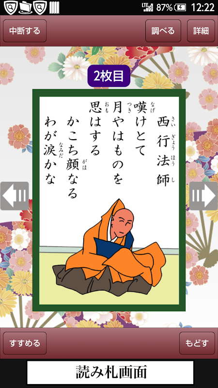 かるたの読み上げの他、短歌の意味や決まり字を調べる機能もあります。競技かるた用としてはもちろん、初めての方、百人一首について勉強したい方にもおすすめです。