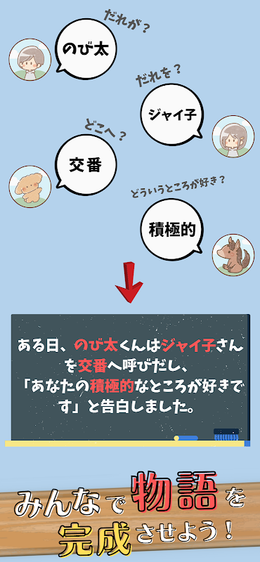 Game yang menggabungkan kalimat semua orang untuk membuat cerita, seperti game "kapan, di mana, siapa, apa". Sempurna untuk menghabiskan waktu sambil tertawa!