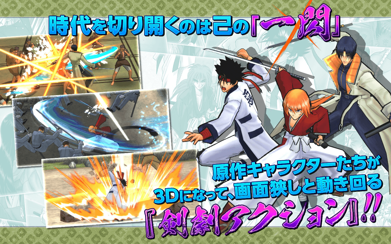 己の剣で未来を斬り拓け――「るろうに剣心」がアプリで参上!原作キャラクターたちが3Dになって、画面狭しと動き回る『剣劇アクション』で、強敵に立ち向かえ!!